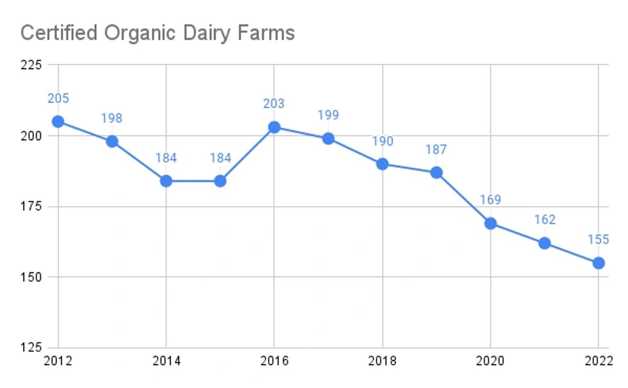 The total number of organic dairy farms fell by 24.39% during the same period as non-organic farms. This is nearly 10% less than conventional diary.